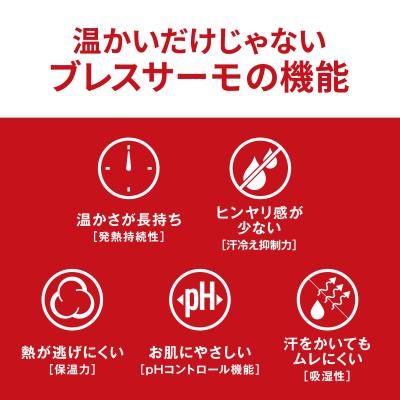 | 機能・素材 | ■ミズノ独自の発熱素材「ブレスサーモ」を使用 ■優れた保湿性 ■肌触りが良い ■肉厚パイル網 ■ズレにくい |