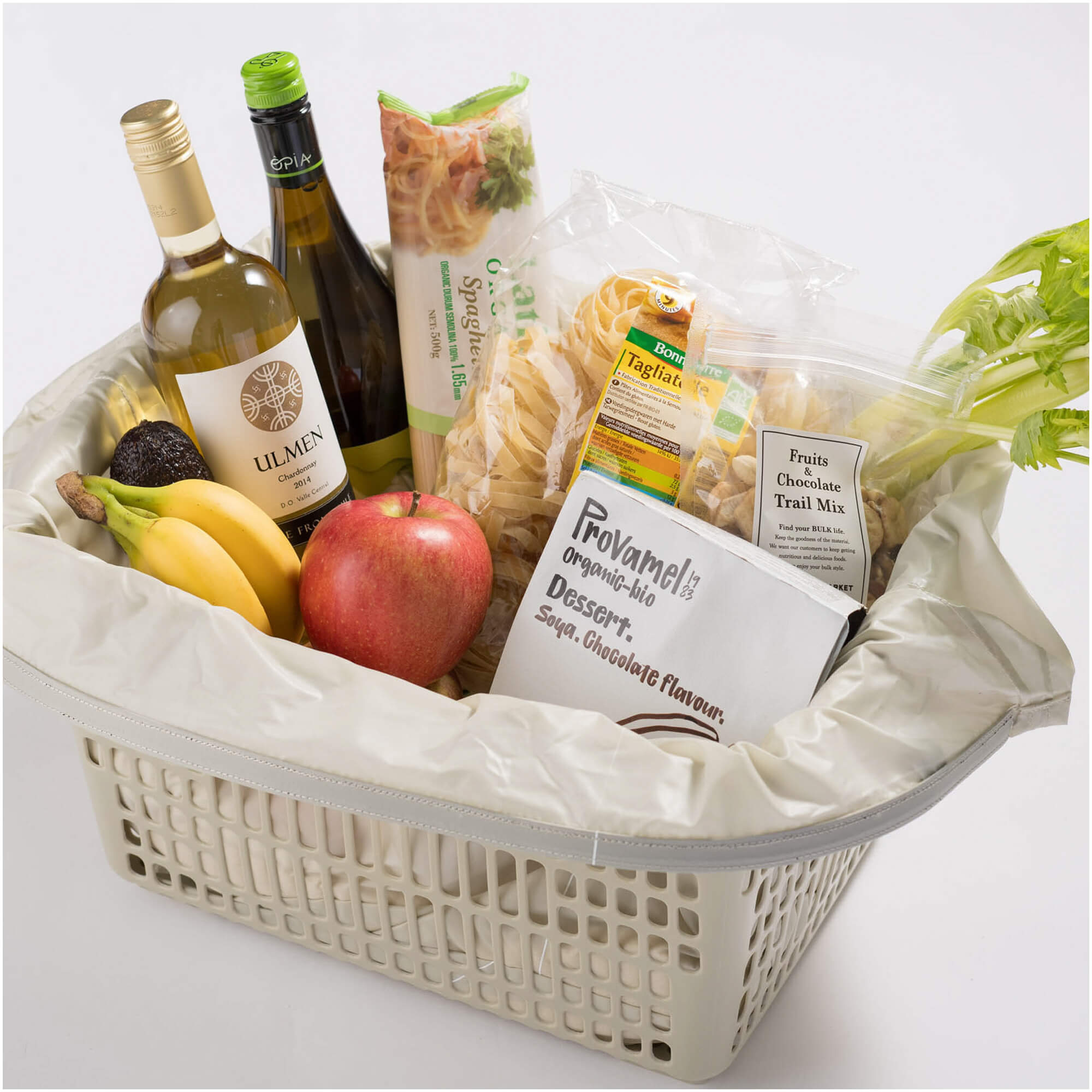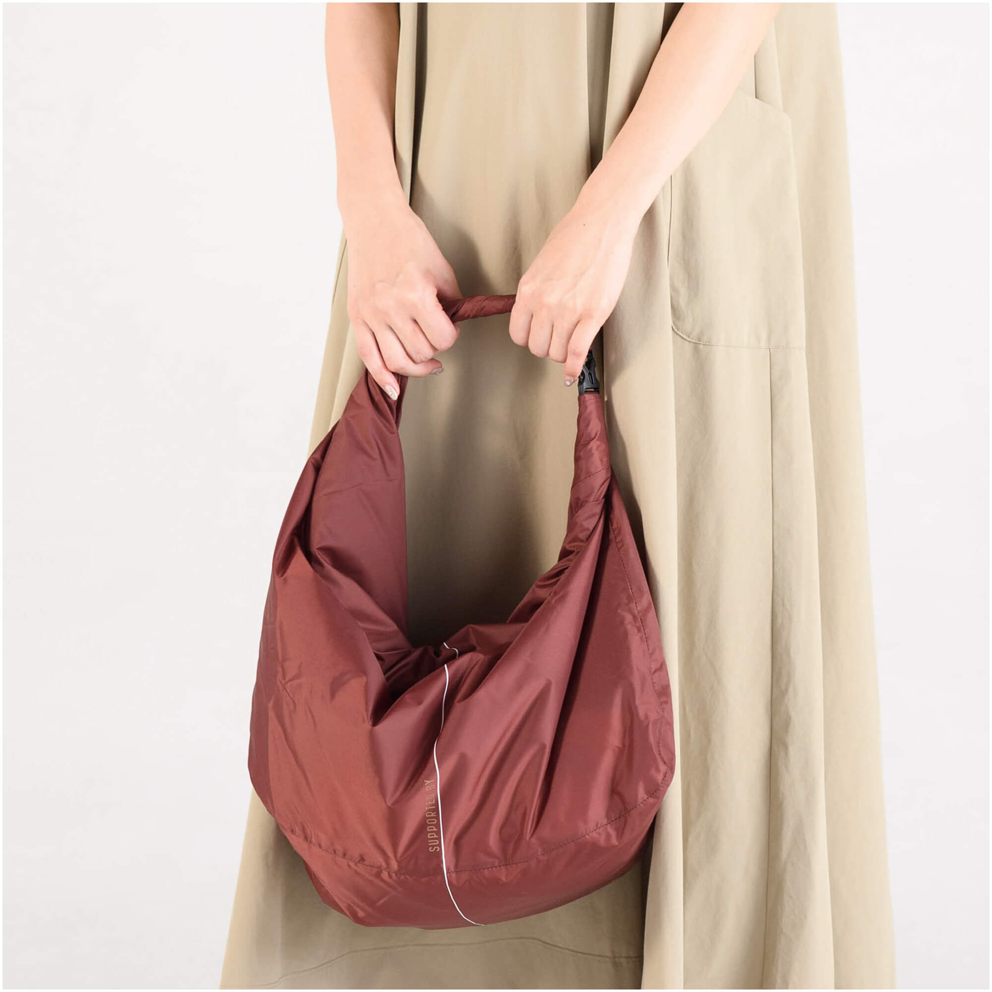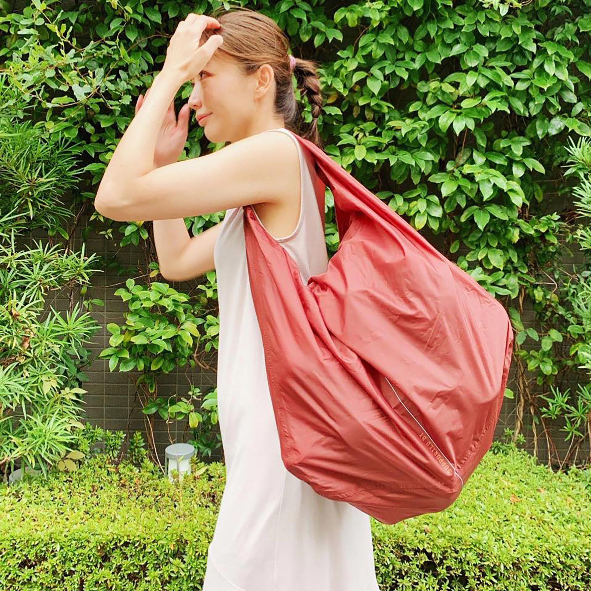 サッカーボールなら2つ、旅行なら1泊分の衣類、買い物なら1週間分のまとめ買いにも対応できる大容量のDRY TOTE。 スーパーマーケットのカゴに直接セットも可。 未使用時は手のひらサイズに折りたたみ、バッグにイン。 急な雨でもバッグがまるごと入ります。