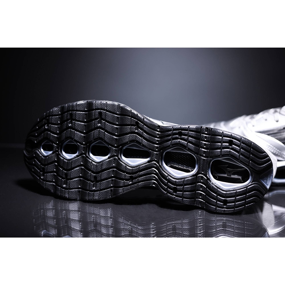 ソールには、シューズに求められる機能である安定性とクッション性。本来なら相反するこの2つの機能を両立する 「MIZUNO WAVE (ミズノウエーブ)」を搭載。 ミズノが独自に開発したWAVE PROPHECYソールは、空洞のあるインフィニティ構造のプレートを採用することで、ミッドソールがへたる原因を最小限に抑えている。