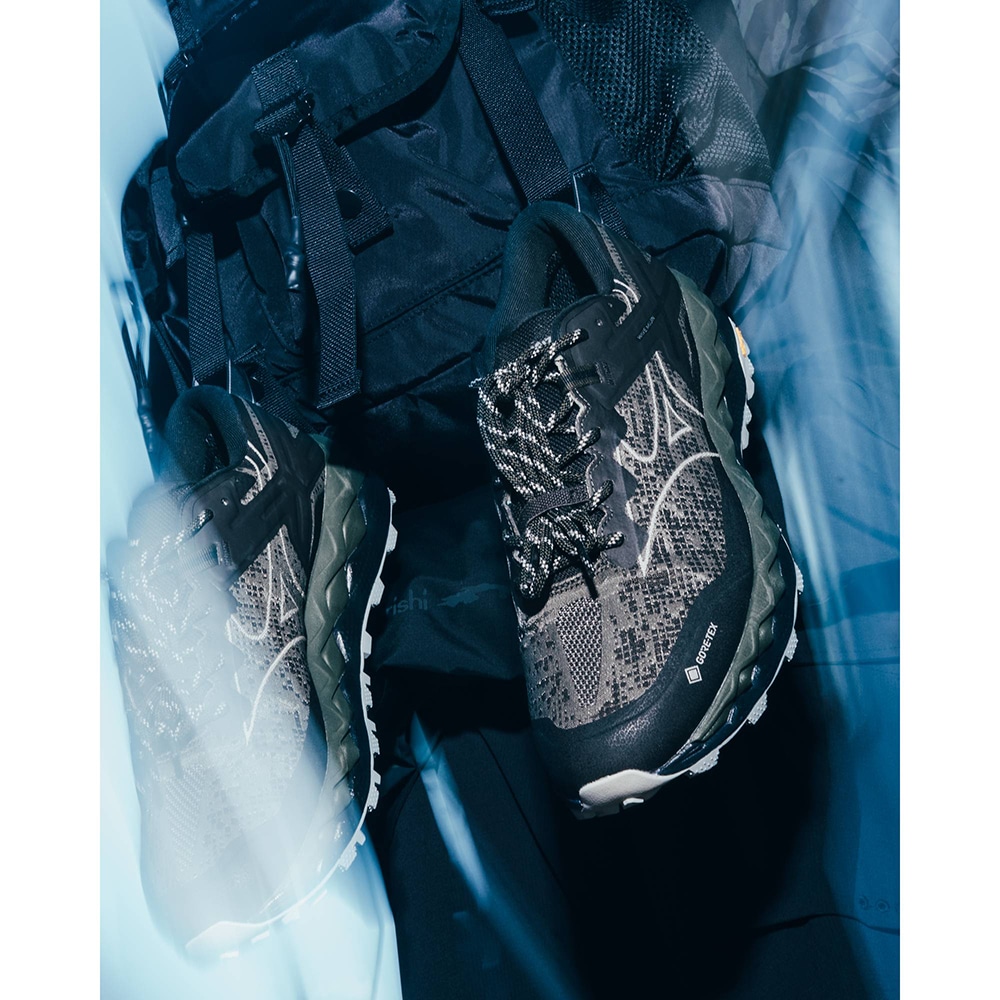 「WAVE MUJIN LS GTX」 は、トレイルランニングシューズの 「WAVE MUJIN 10」 にGORE-TEX® ファブリクスを搭載し、スニーカー市場にフィットする様、アレンジを施している。