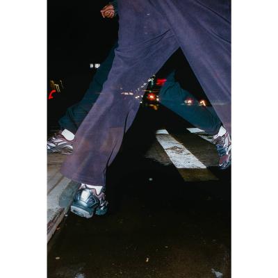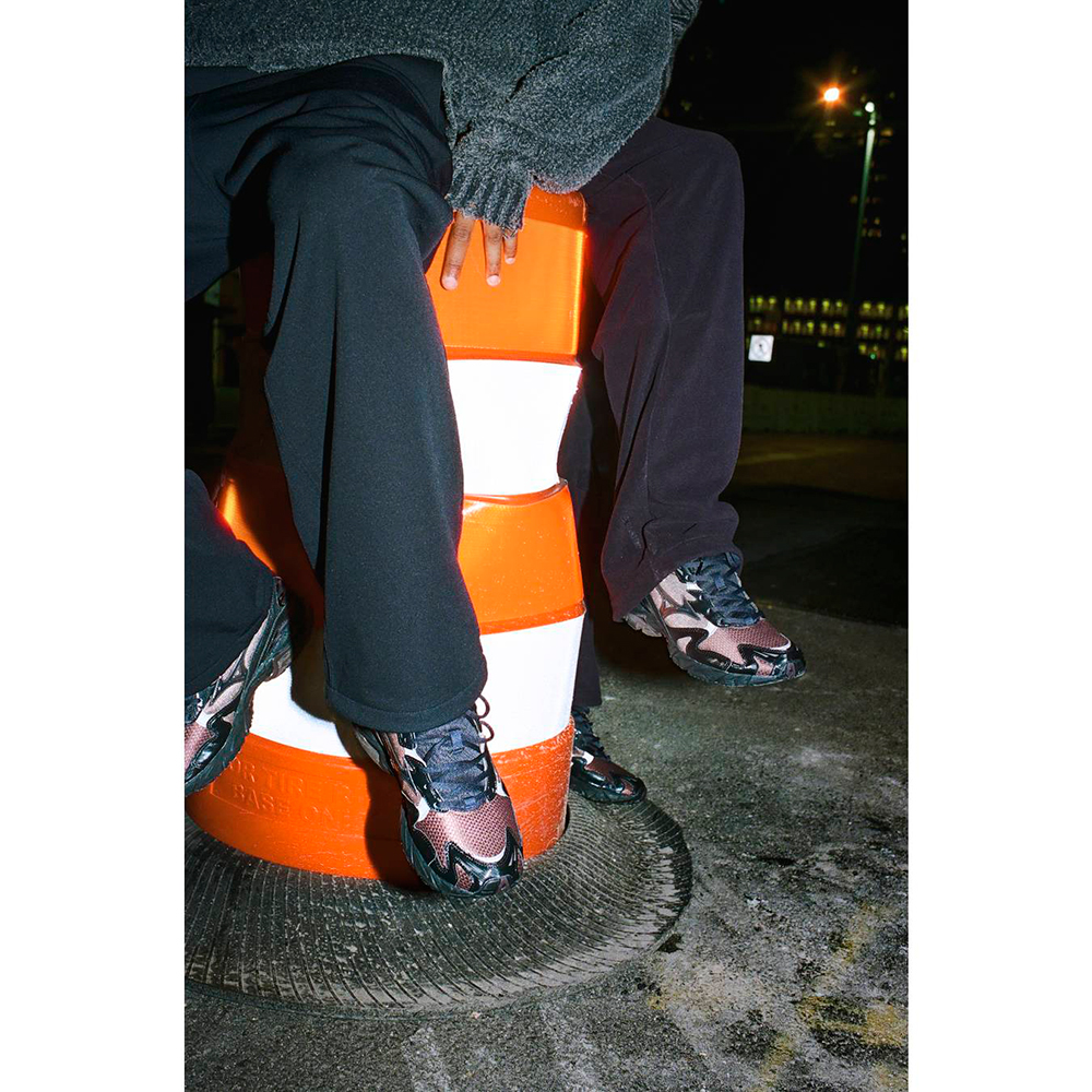 一見するとダークトーンでまとめられたトーナルなカラーリングの本モデルだが、アッパーはディテール毎に微配色、異素材使いとなっており複雑に構成されている。俯瞰で見ると大きな無機質の塊でも、実際は刻一刻とさまざまな表情の変化を持つ都市の風景そのものを表し、無機質の中に見える本質の一瞬を切り取っている。また、ヒールにはアスファルトに滲んだオイルの反射の如く、七色に変化するリフレクターが搭載されている。