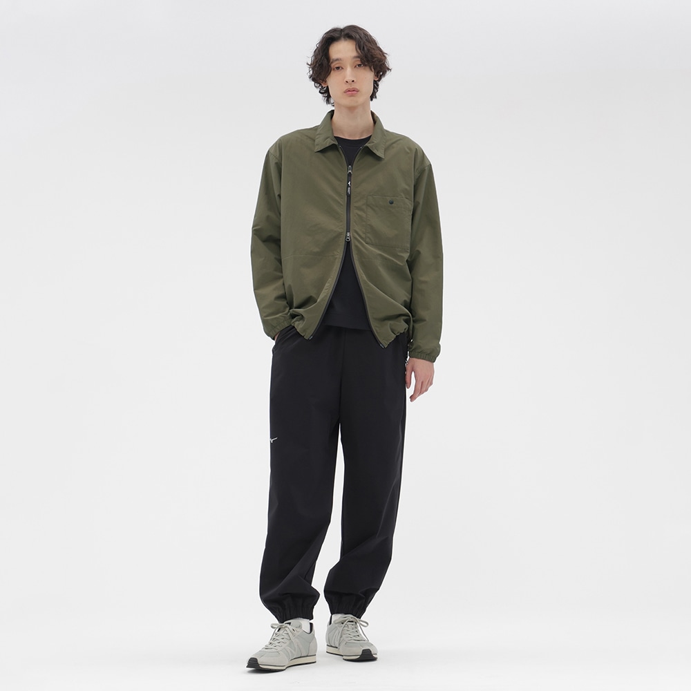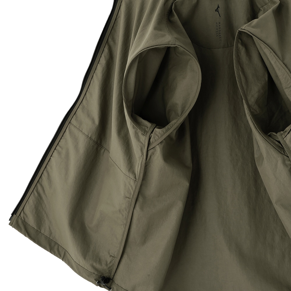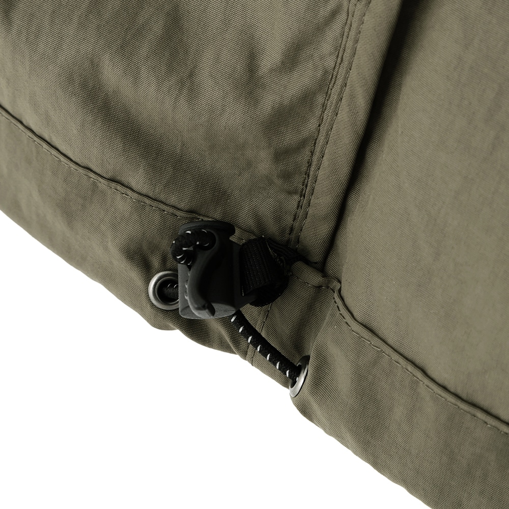 フロントには逆開仕様のファスナーを使用し、下側のスファスナーを開けたり、裾のスピンドルを絞って動きをもたせたスタイリングが可能な一着。