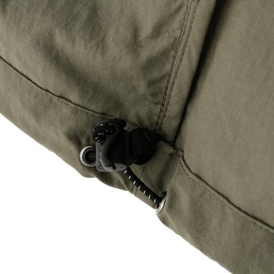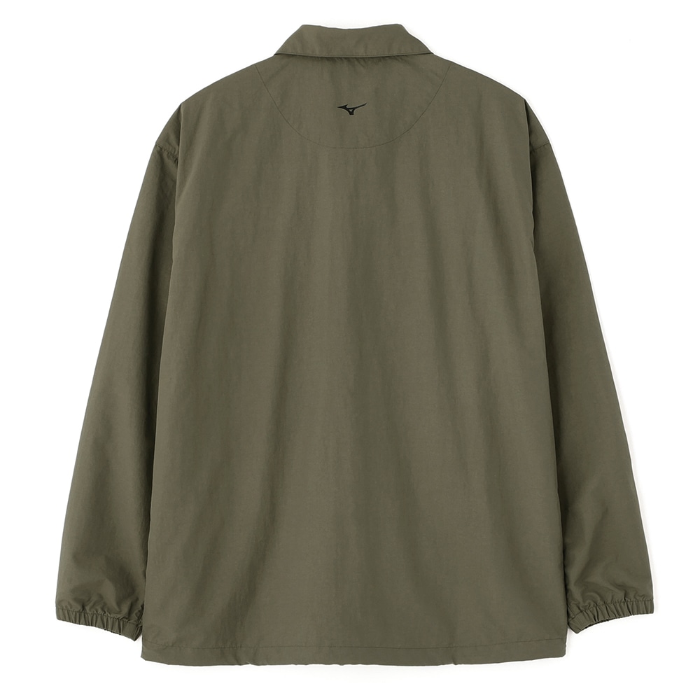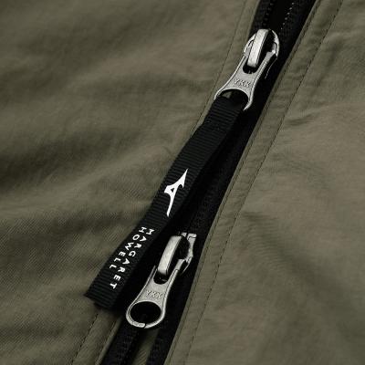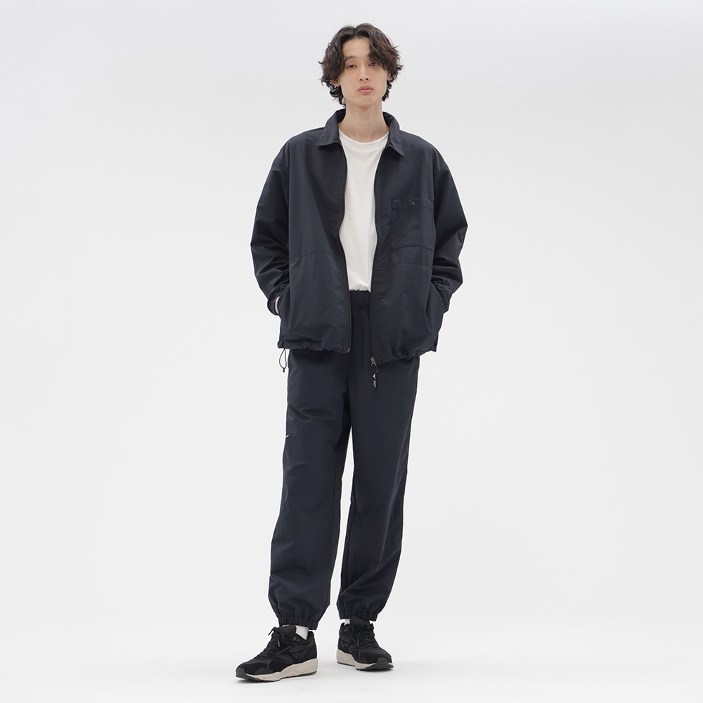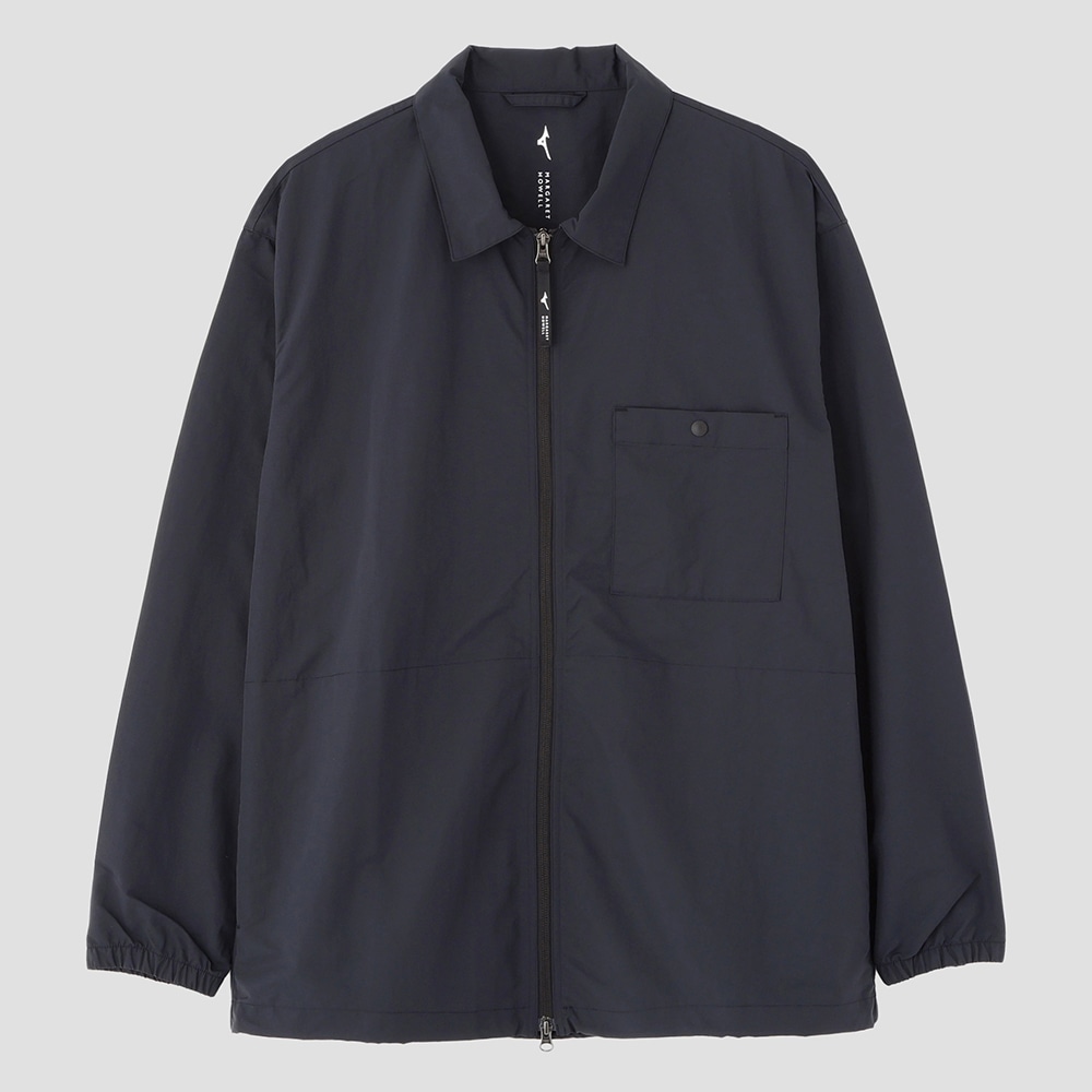 フロントには逆開仕様のファスナーを使用し、下側のスファスナーを開けたり、裾のスピンドルを絞って動きをもたせたスタイリングが可能な一着。