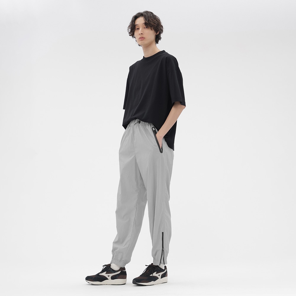 裾にマチ付きジップを備え、開閉によってストレートとテーパード、2通りのシルエットを切り替えられる仕様。
