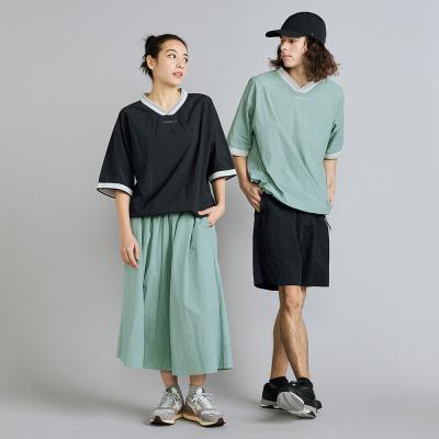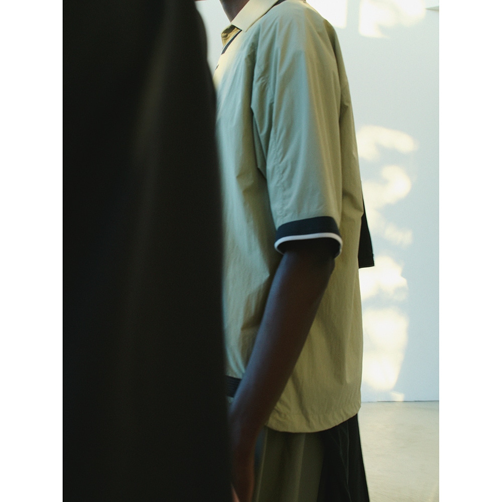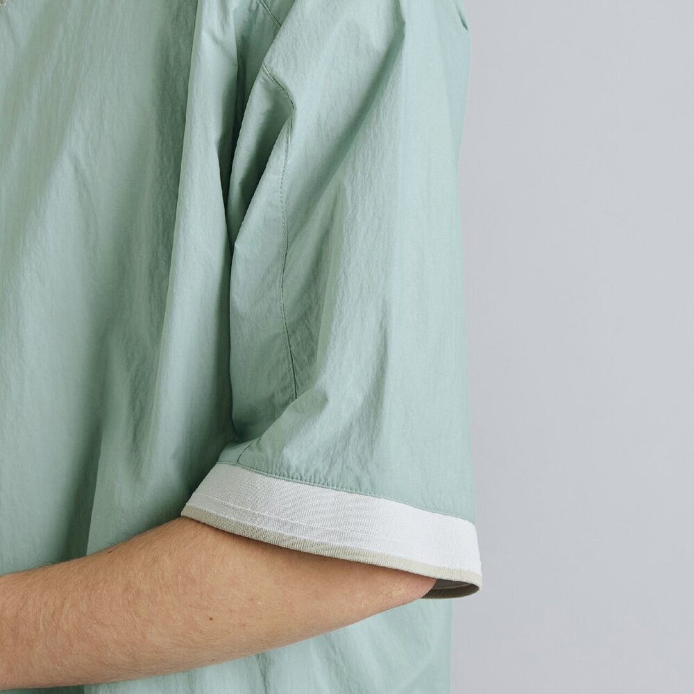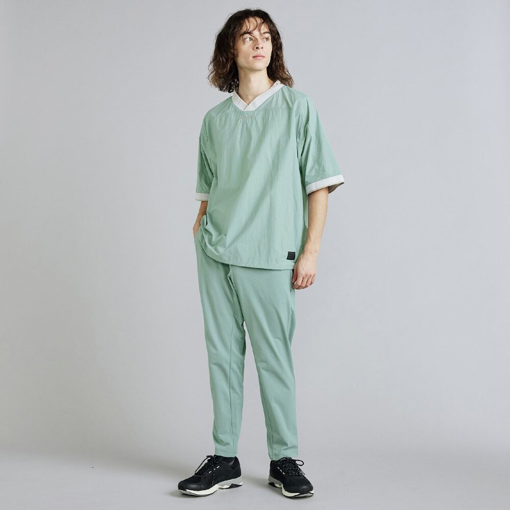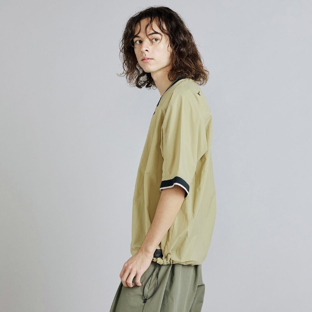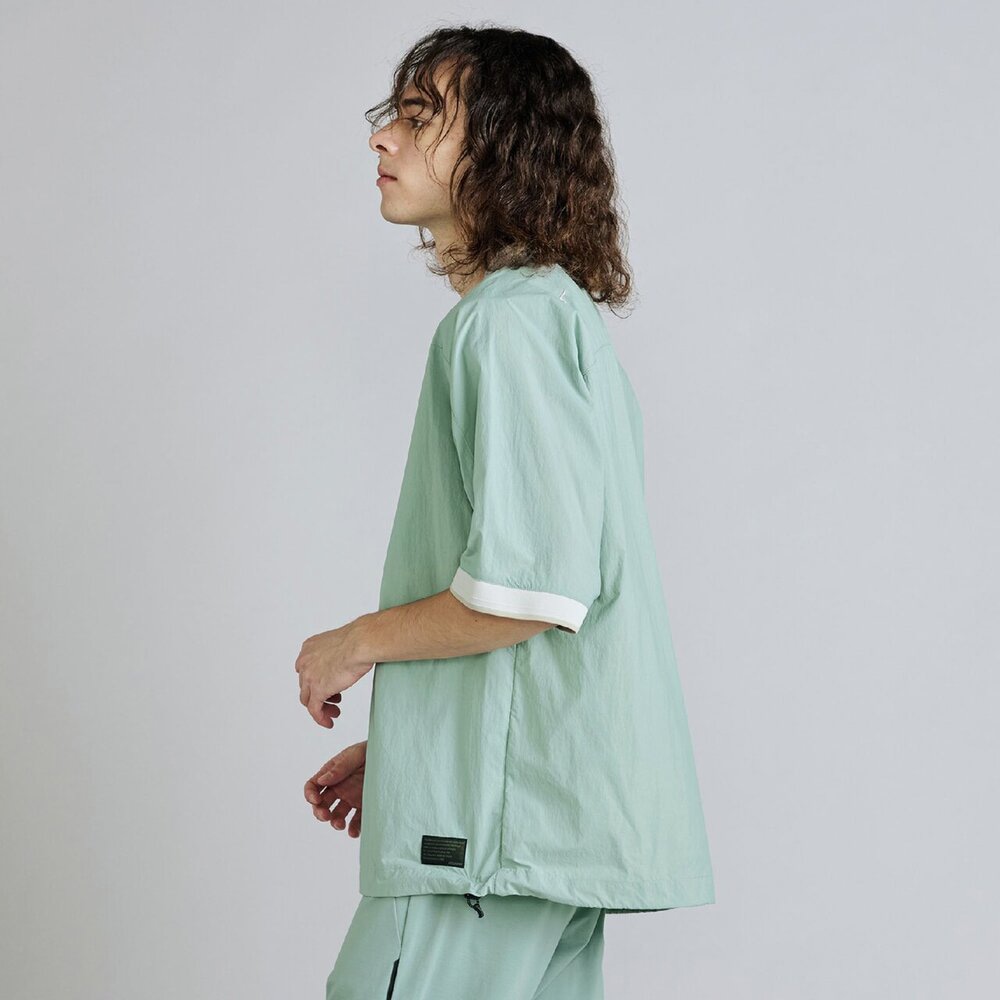 軽量で高い撥水性とスパンライクな質感のタスランナイロン素材を使用した布帛Tシャツ。