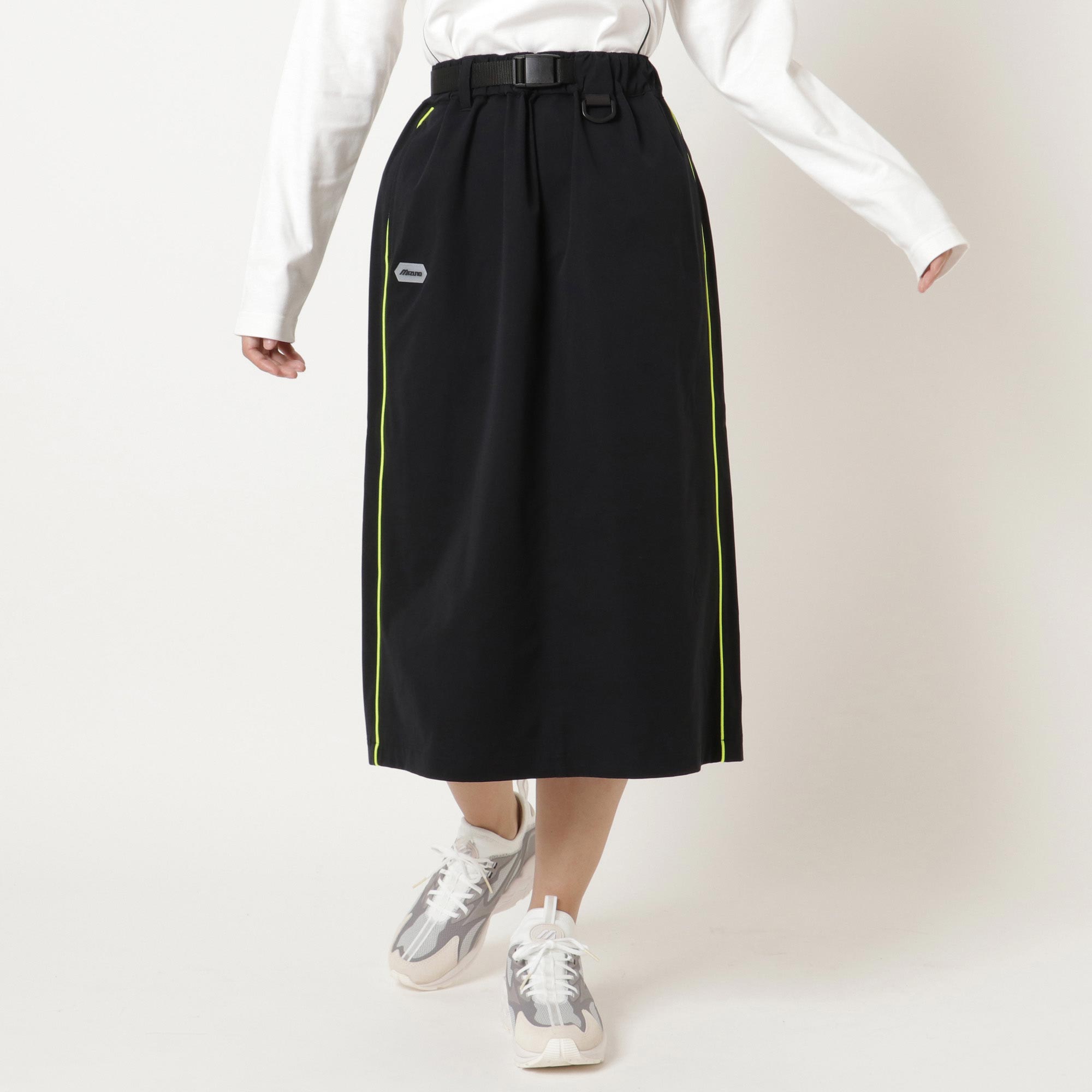 ■ウエストベルトでサイズ調整可能、サイドポケット(ファスナー無)、動きやすさを考慮したバックのスリット