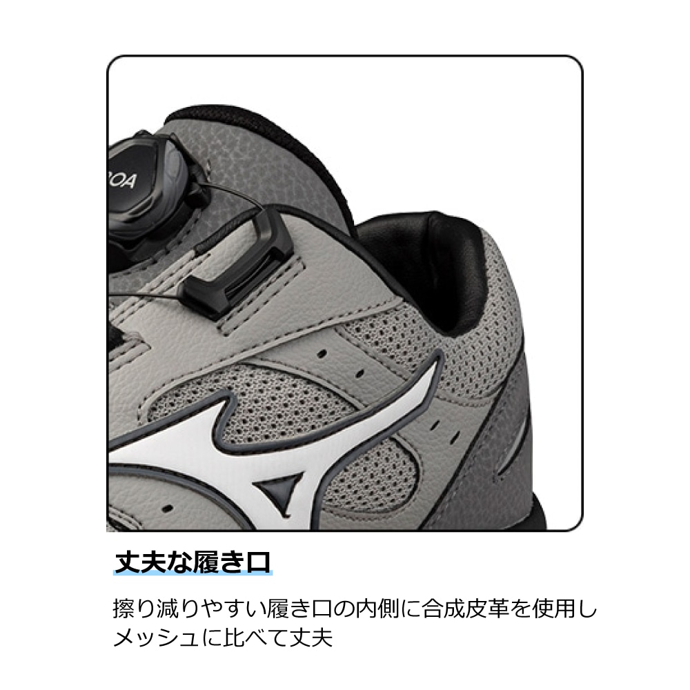 擦り減りやすい履き口の内側に合成皮革を使用しメッシュに比べて丈夫