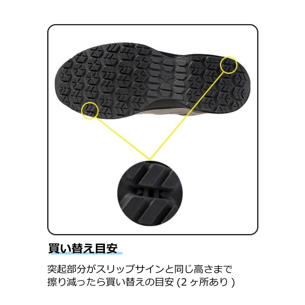 突起部分がスリップサインと同じ高さまで擦り減ったら買い替えの目安(2か所あり)