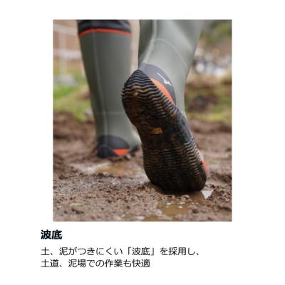 ■波底:土、泥がつきにくい「波底」を採用し、土道、泥場での作業時も快適