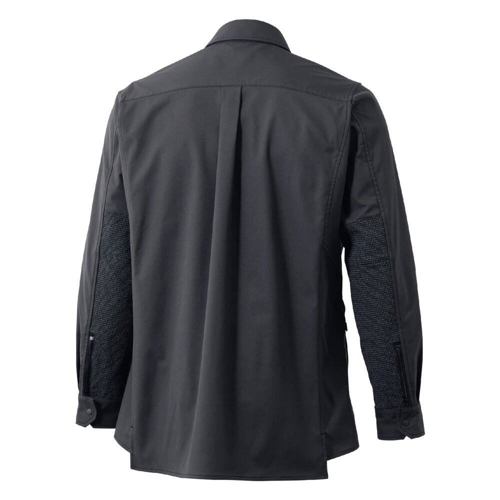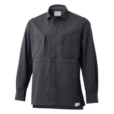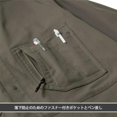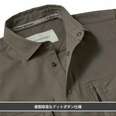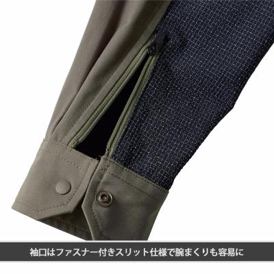 ■フロントはドットボタン仕様で着脱も容易。袖口にファスナー付きスリットを設け袖をまくる際のストレスを軽減。