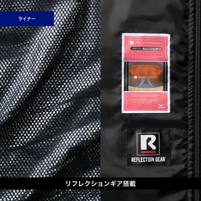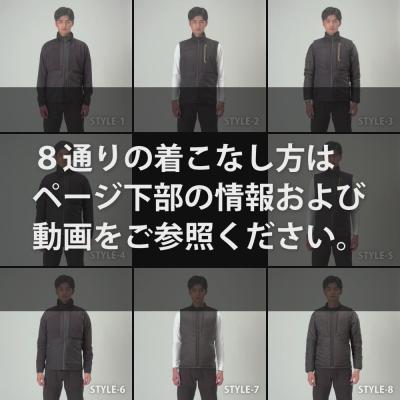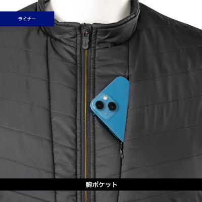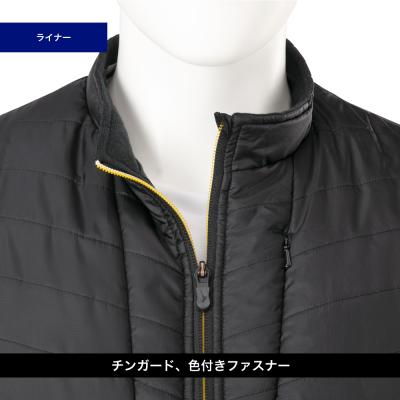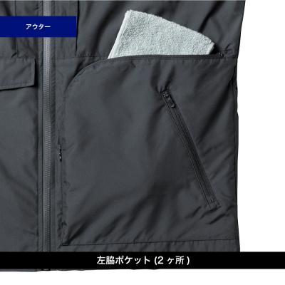 | 素材 | アウター袖部分:ナイロン100% アウター身頃部分:表地:ポリエステル100%、裏地:ポリエステル100% ライナー:表地:ポリエステル100%、裏地:ポリエステル100% 中綿:本体:ポリエステル83%、合成繊維(ブレスサーモ)17%、袖:ポリエステル100%、後身頃上部芯地:ナイロン100% |