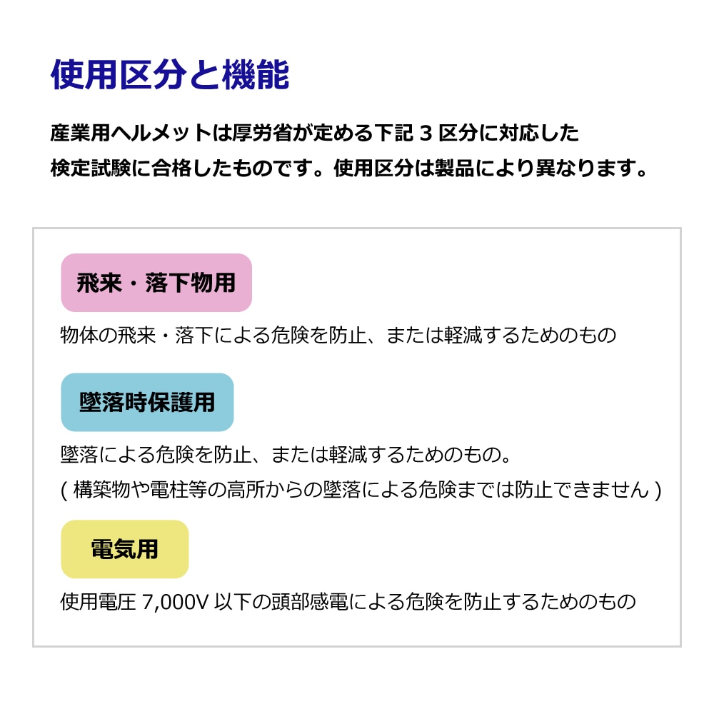 産業用ヘルメットは厚労省が定める下記3区分に対応した検定試験に合格したものです。使用区分は製品により異なります。