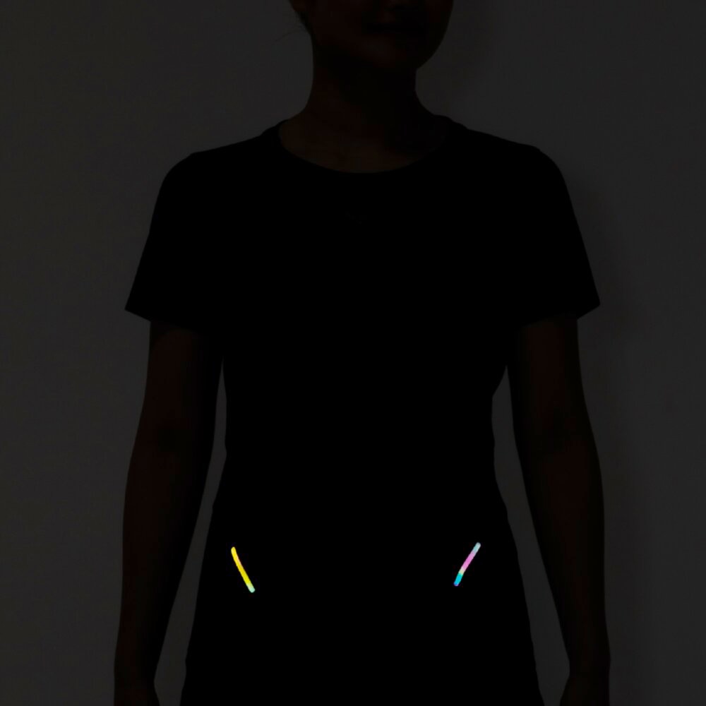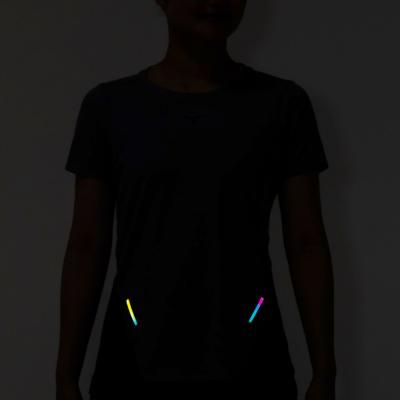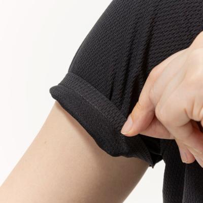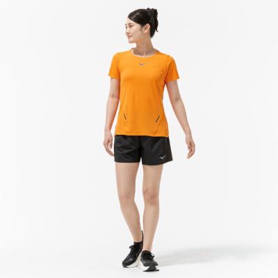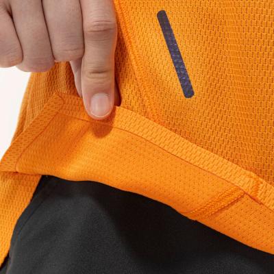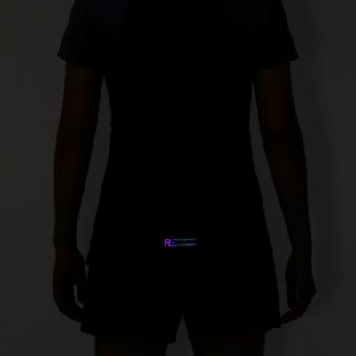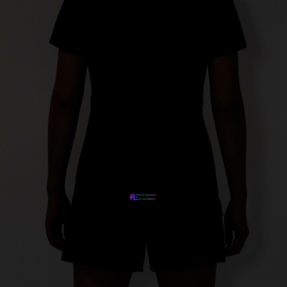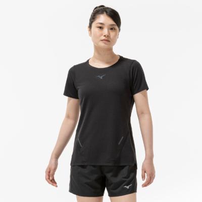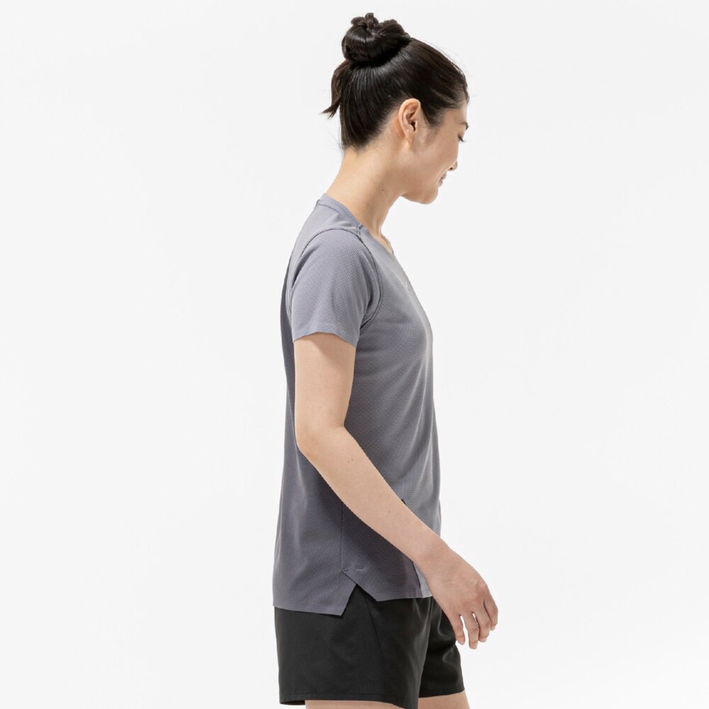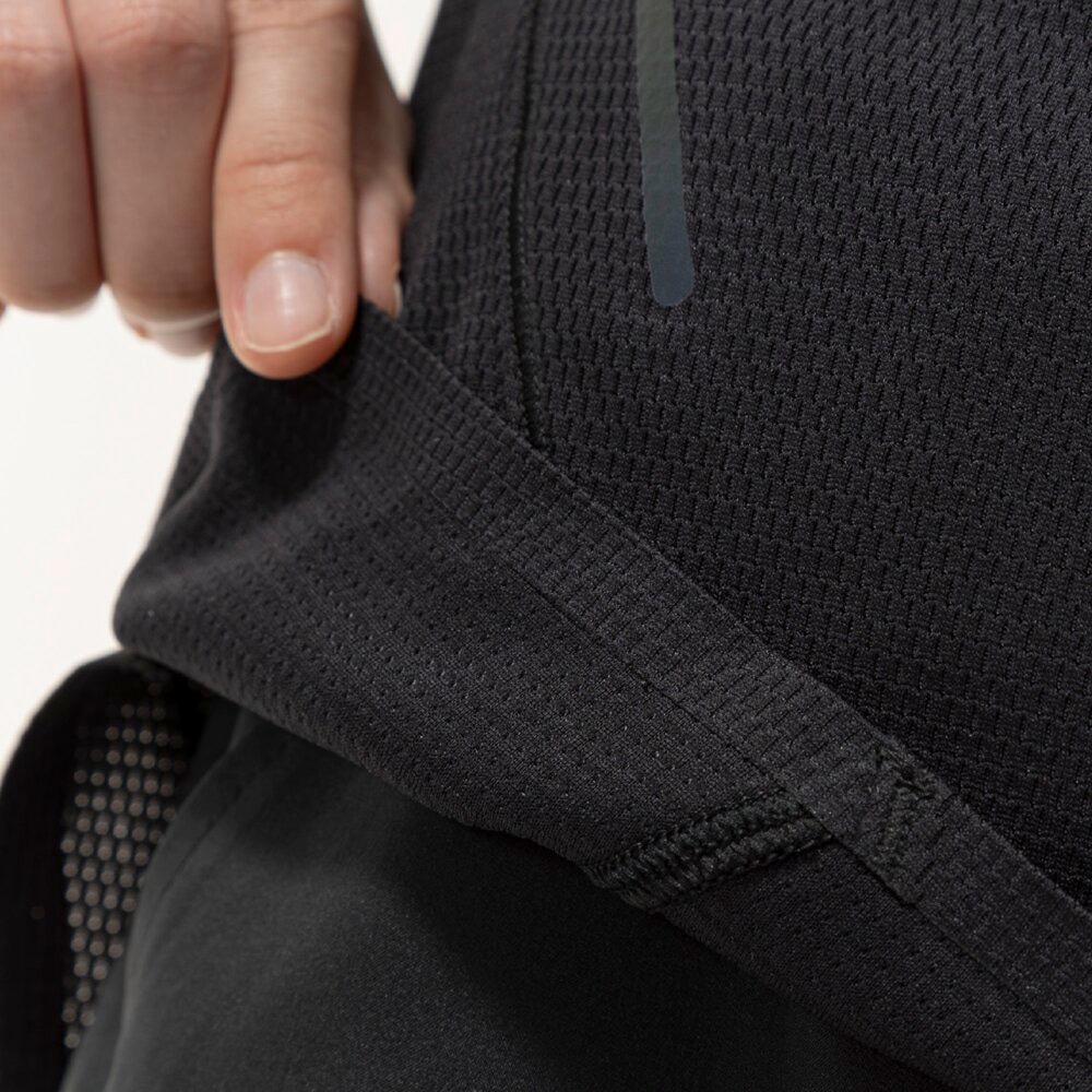 汗の膜が生地の通気性を低下させ、衣服内の温度上昇やべたつき感などの原因となっていることに着目し開発された素材『ドライエアロフロー』。襟元と裾、袖口の圧着仕様が肌当たりを軽減し、快適なランニングをサポートします。また、再帰反射プリントを使用しているため、ナイトランにも配慮した設計になっています。