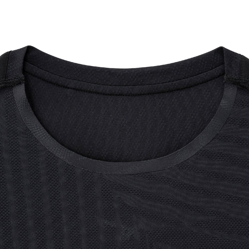■襟元と裾、袖口の圧着仕様が肌当たりを軽減し、快適なランニングをサポートします。