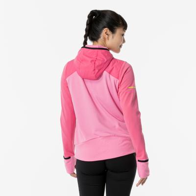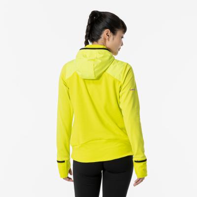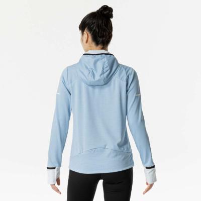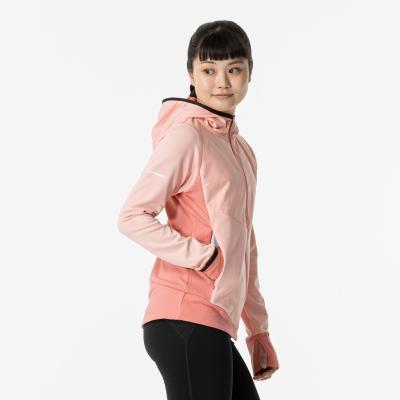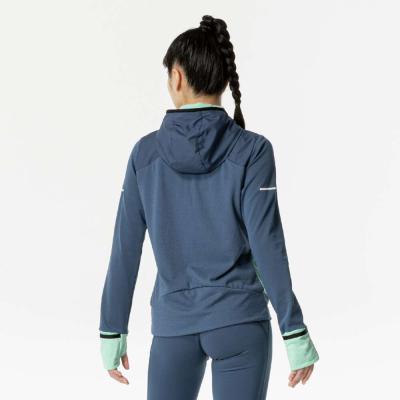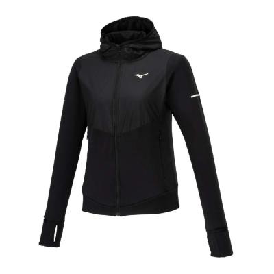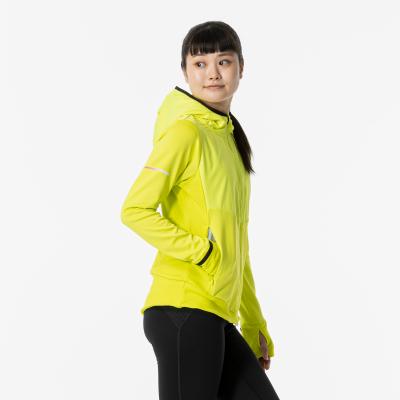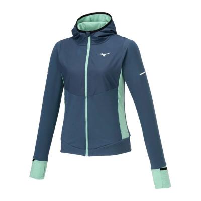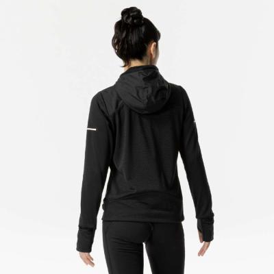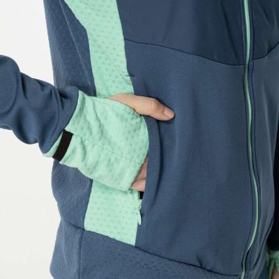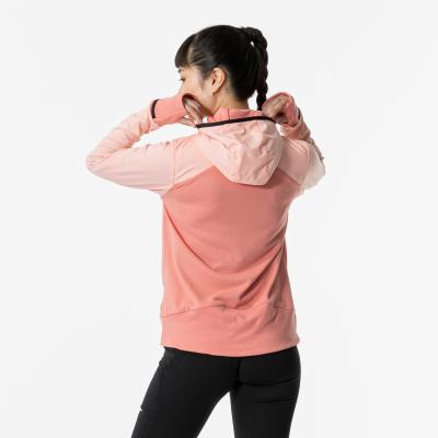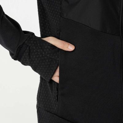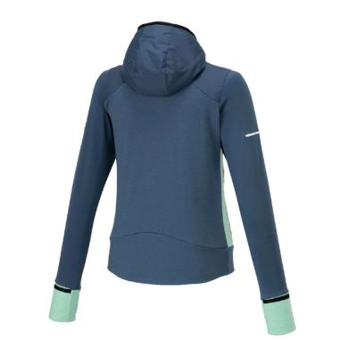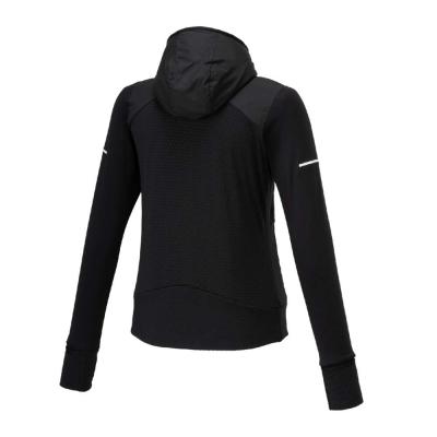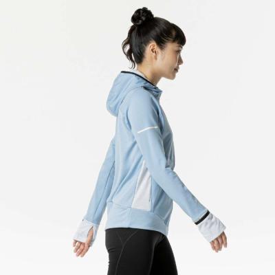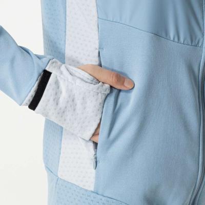 ■裏起毛ストレッチ素材と布帛素材のハイブリッドシャツ(フルジップ仕様、フード付き)。