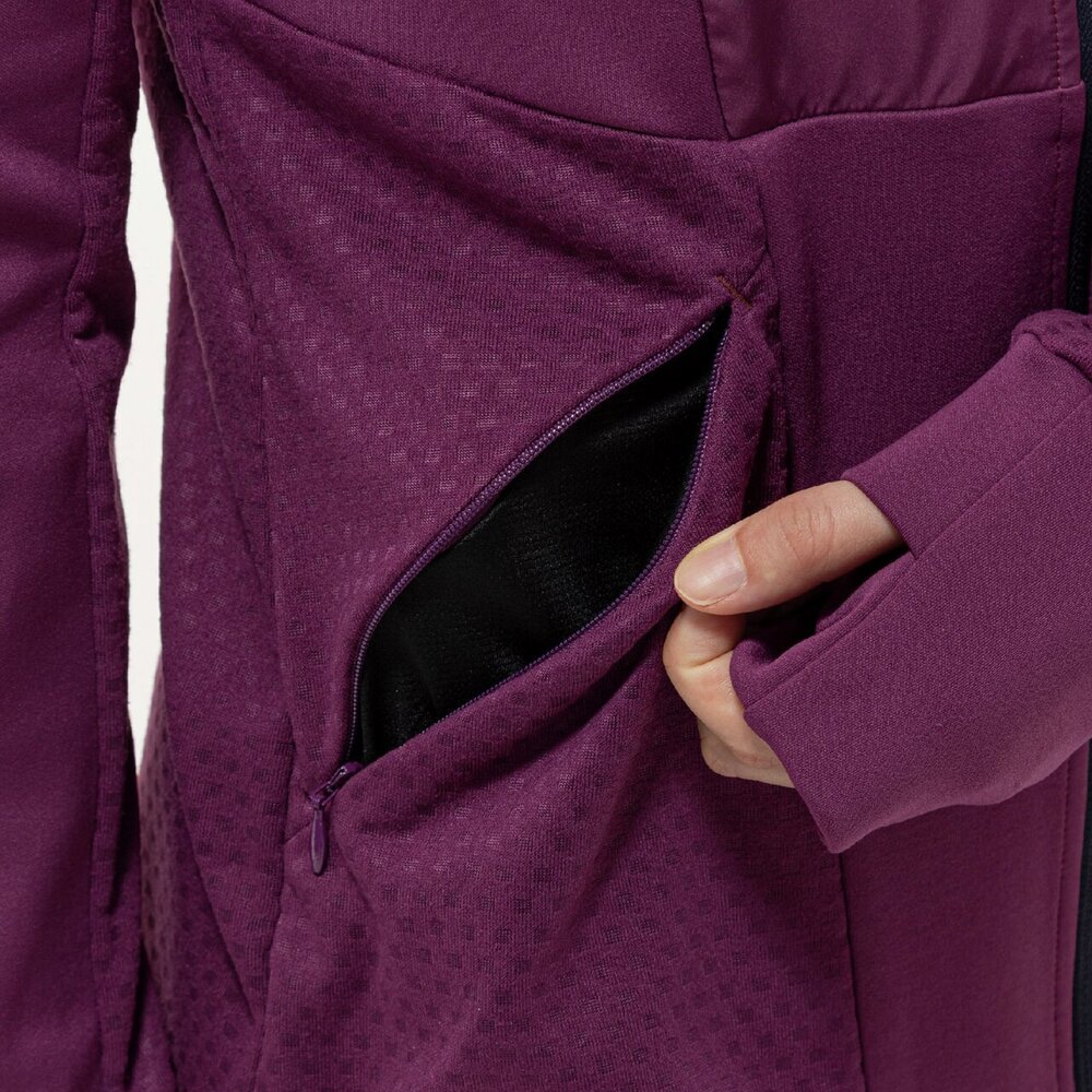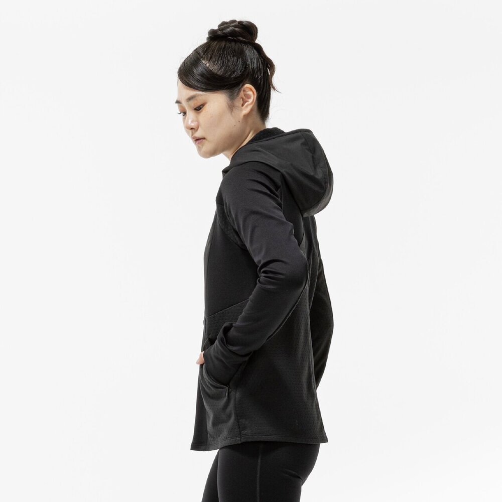 フロントジップ、フード付きで天候に応じた着こなしが可能で、両脇にはジップ付きのポケットがあり、収納力にも優れています。