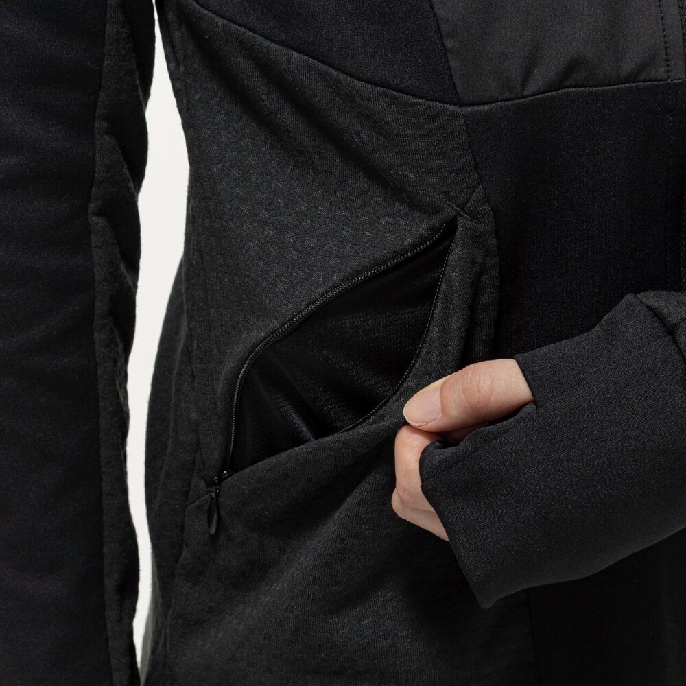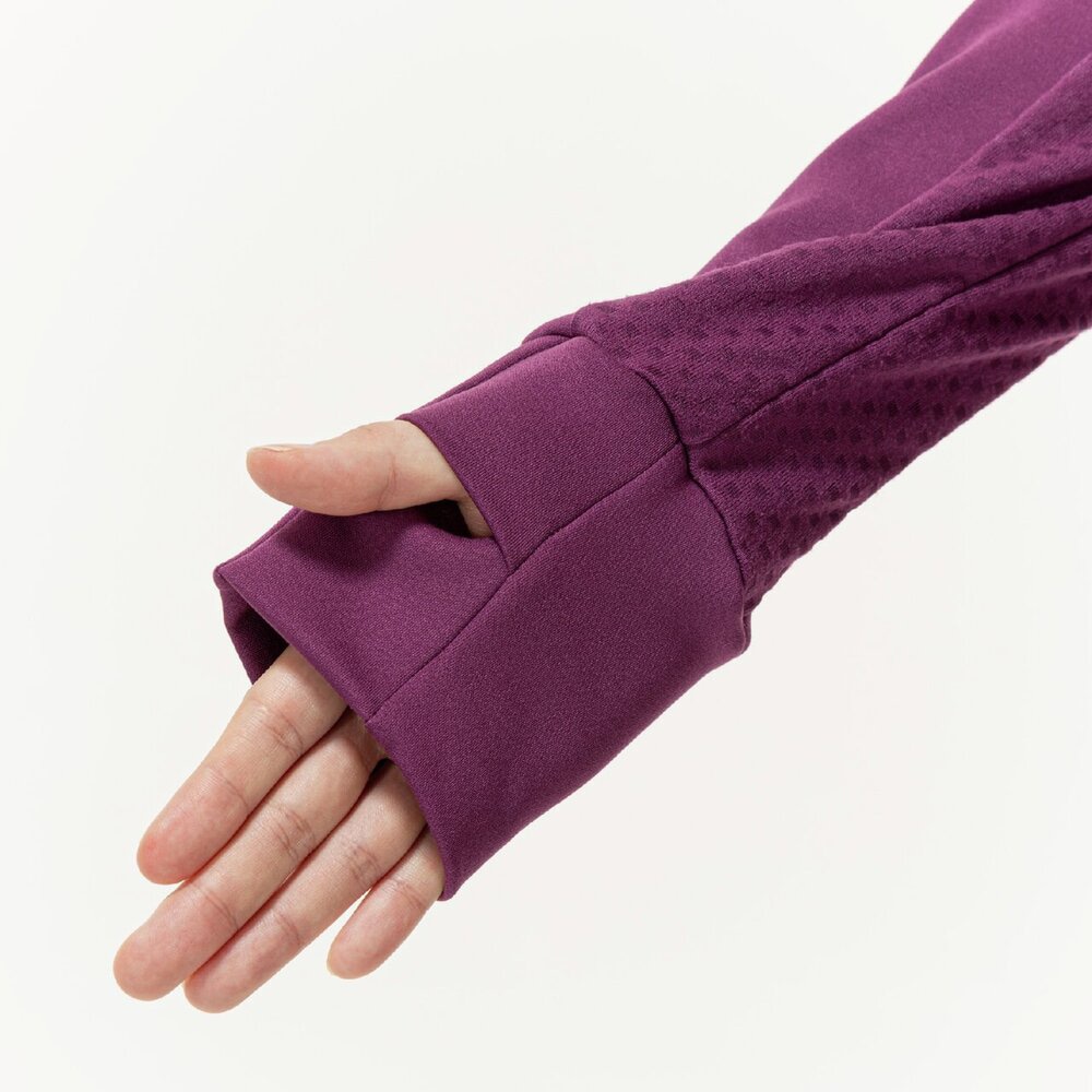 ストレッチ性に優れた裏起毛のニット素材と風を通しにくい布帛素材のハイブリッドシャツ。手甲まで覆えるサムホール設計で寒い冬にも活躍します。