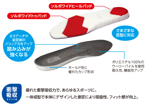 ・つま先部と、かかと部のソルボパッドをワイドタイプに変更することで、衝撃吸収性を高めました。(約13%UP)