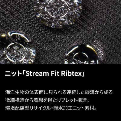 環境に配慮したエコフレンドリー素材であり、バイオミメティックス由来のリブレット構造で低抵抗を実現した、撥水・ストレッチニット素材:Stream Fit Ribtex 使用の競泳レース用水着“GX・SONIC STREAM”です。