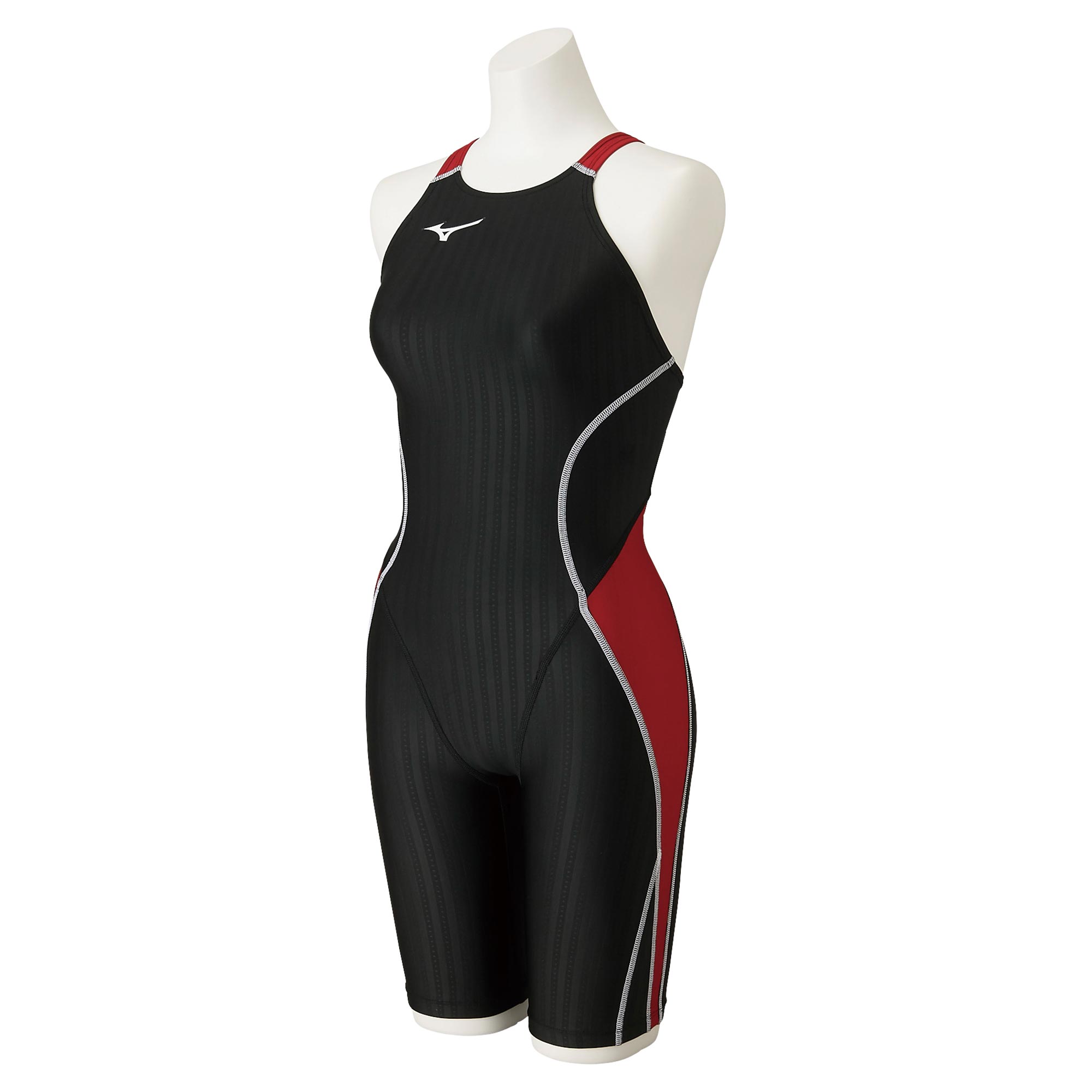生地表面への撥水とストライプとダイヤ柄の凹凸形状のエンボス加工により、水の流れを整えることで低抵抗を実現した素材。よく伸びて体にフィットするストレッチ性のあるニット水着。